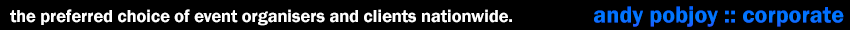 Andy is a mainstay on the Australian corporate scene, and can easily accommodate your specific and exacting requirements. Andy is also able to easily fly anywhere around Australia, and regularly performs interstate for corporate clients.